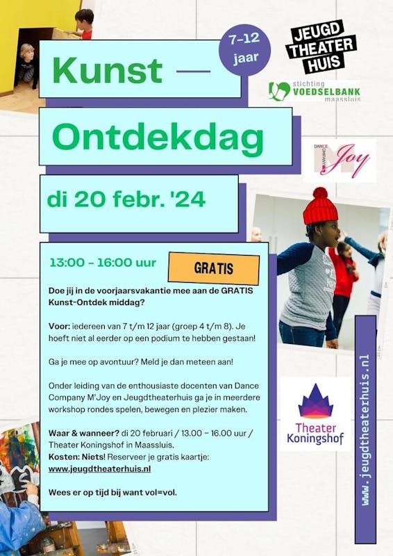 Doe je mee in de voorjaarsvakantie aan de GRATIS Kunst-Ontdekmiddag? Iedereen van 7 t/m 12 jaar (groep 4 t/m 8). Onder leiding van enthousiaste docentenvaan Dance Company M,Joy en Jeugdtheaterhuis ga je in meerdere workshops rondes spelen, bewegen en plezier maken.