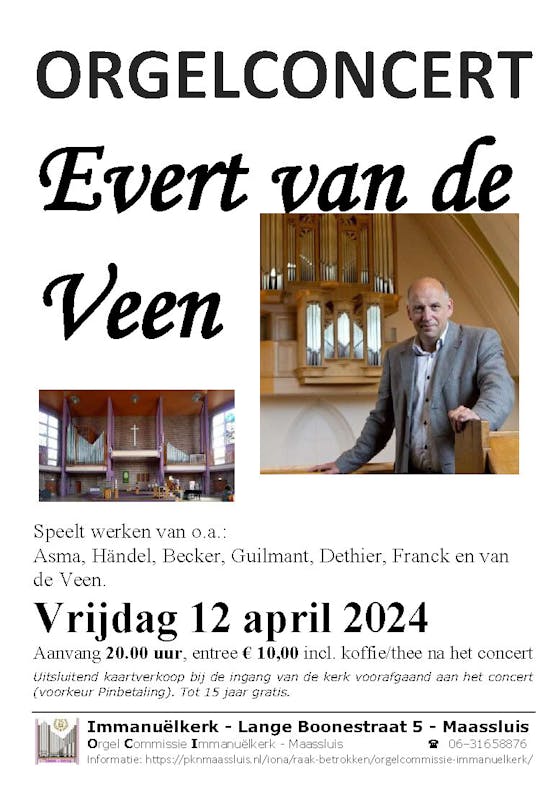 Evert van de Veen is een veel gevraagd koorbegeleider. Evert is ook kerkorganist (“het mooiste aspect van mijn vak”). Hij speelt de zondagse erediensten in de Gereformeerde kerk van Voorthuizen, de Dorpskerk van Beekbergen en de Hervormde kerk (PKN) te Putten.