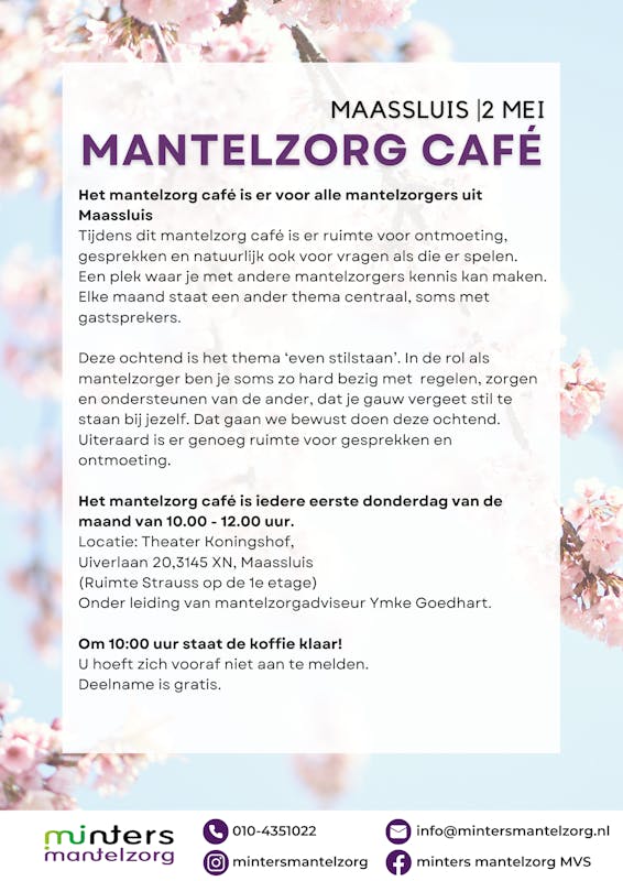 Een plek waar je met andere mantelzorgers kennis kan maken. Elke maand staat een ander thema centraal, soms met gastsprekers. Deze ochtend is het thema ‘even stilstaan’. In de rol als mantelzorger ben je soms zo hard bezig met regelen, zorgen en ondersteunen van de ander, dat je gauw vergeet stil te staan bij jezelf. Dat gaan we bewust doen deze ochtend. Uiteraard is er genoeg ruimte voor gesprekken en ontmoeting.