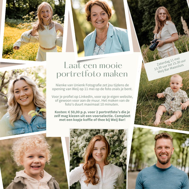 Fotograaf Nienke @unienkfotografie zet jou tijdens de feestelijke opening van Weij ontspannen en zoals je bent op de foto. Het resultaat: een Unienke professionele portretfoto van jou voor je profiel, voor op je eigen website, of voor aan de muur. De shoot duurt ongeveer 10 minuten.