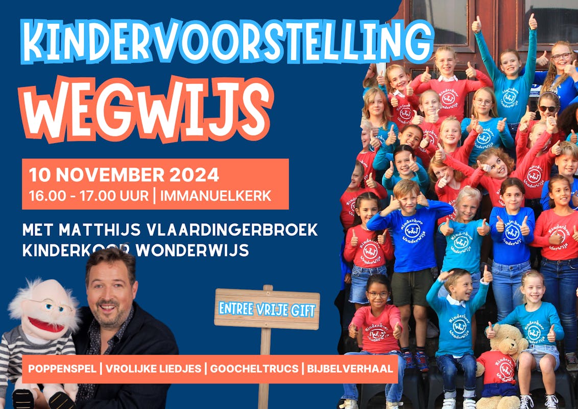 Op zondag 10 november vindt de vrolijke kindervoorstelling Wegwijs plaats in de Immanuelkerk. De voorstelling is geïnspireerd op het verhaal van de verloren zoon en wordt op unieke wijze tot leven gebracht door verhalenverteller en buikspreker Matthijs Vlaardingerbroek. Kinderkoor Wonderwijs zal samen met de band het verhaal muzikaal omlijsten.