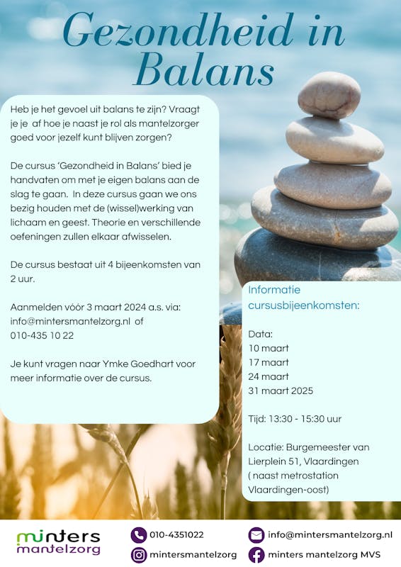 Heb je het gevoel uit balans te zijn? Vraagt je je af hoe je naast je rol als mantelzorger goed voor jezelf kunt blijven zorgen?