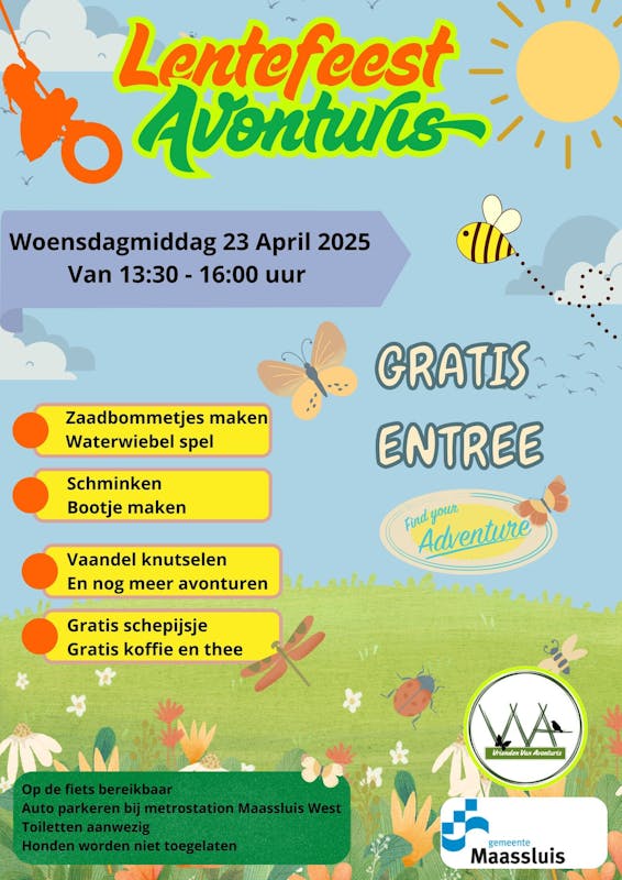 Samen met de Gemeente Maassluis open wij het buitenspeelseizoen met een geweldig feest in Natuurspeelplaats Avonturis. Het feest heeft het thema Lente gekregen en zullen er leuke gratis activiteiten worden aangeboden. Ook is er een gratis kopje koffie of thee of een glaasje limonade. Na alle leuke activiteiten te hebben uitgevoerd kun je ook één gratis schep ijsje krijgen en ter compensatie een heerlijke appel! Kortom genoeg te doen en zonder jullie geen feest!
