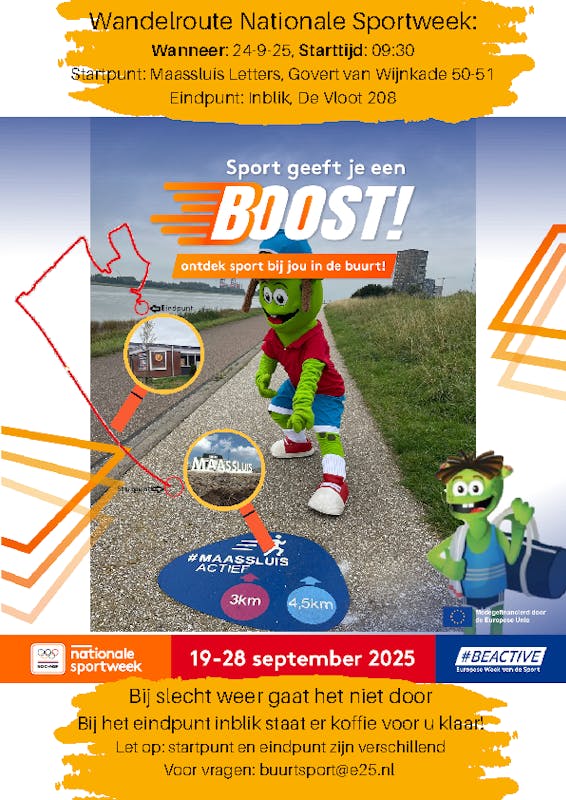 Voor de nationale sportweek organiseert E25 een wandelroute voor senioren. De route start bij de MAASSLUIS letters, Govert van Wijnkade 50 en eindigt bij ons kantoor InBlik, de vloot 208 onder het genot van een lekker bakje koffie.