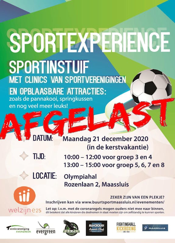 Zet hem alvast in je agenda, de SportExperience is verzet van maandag 21 december naar maandag 22 februari 2021 o.v.b. Coronamaatregelen! Ontdek allerlei verschillende sporten die in Maassluis aangeboden worden. Op deze dag worden clinics verzorgd door de verenigingen in de buurt, denk onder andere aan hockey en basketbal en nog veel meer uitdagende sporten! Naast de clinics kunnen de kinderen ook lekker springen op springkussens en voetballen in de pannakooi!
