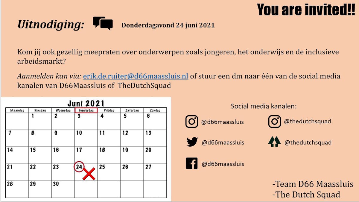 Op 24 Juni bespreekt D66Maassluis aan de hand van een aantal progressieve stellingen de ontwikkelingen met the Dutch Squad. Landelijke politica's Joan Nunnely (D66), Milka Yemane (GroenLinks), Isaura Carrilho (DENK) en Fatihya Abdi (PvdA) vormen samen de Dutch Squad.