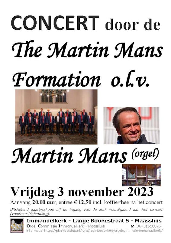 The Martin Mans Formation (TMMF) zal met Martin Mans (orgel) een inspirerend concert met samenzang verzorgen op vrijdagavond 3 november in de Immanuëlkerk te Maassluis. Aanvang 20.00 uur.