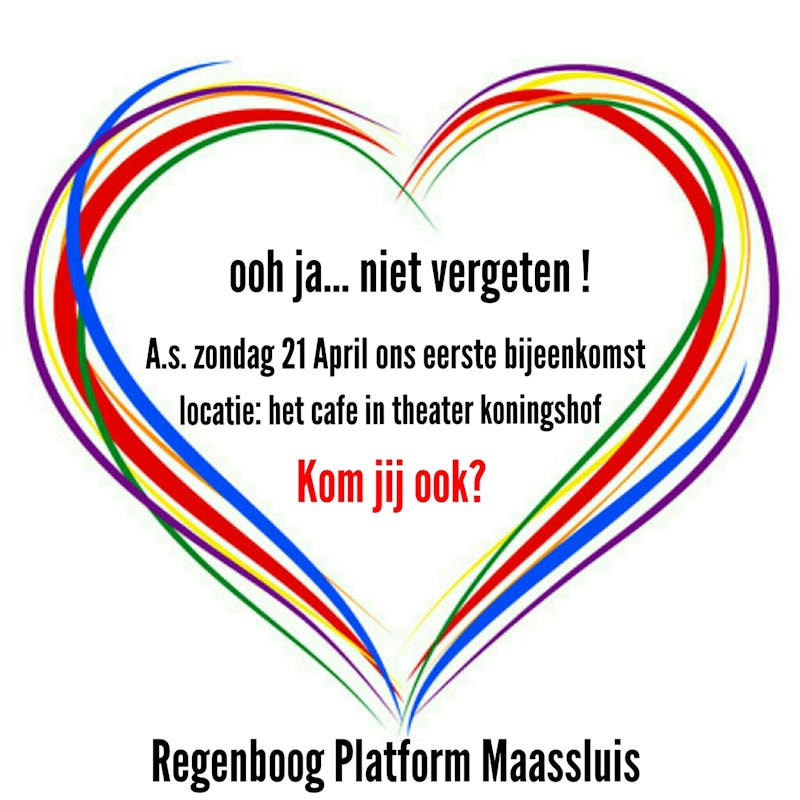 Reminder: a.s. zondag 21 april 19.00-21.00u is onze eerste publieke bijeenkomst als Regenboog Platform Maassluis. Locatie: in het café van theater Koningshof. Het is bedoeld voor eenieder die te maken heeft met onderwerpen gericht op LGBTQ+ situaties. Betreft jezelf, als ouders, als werkgever of sportclub. Iedereen is welkom om te komen. (Consumpties voor eigen rekening)