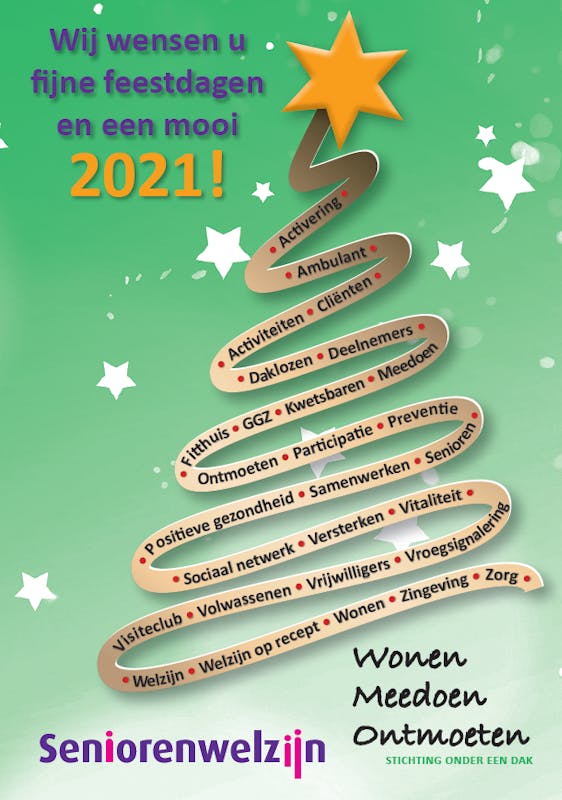 Medewerkers en vrijwilligers van Seniorenwelzijn wensen iedereen, ook in deze vreemde tijd, fijne feestdagen. We hopen u, zodra dat weer mag en veilig kan, weer snel en in goede gezondheid te zien.
