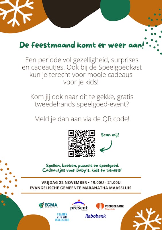 De Speelgoedkast vindt plaats op vrijdagavond 22 november, van 19.00 tot 21.00 uur in de Evangelische Gemeente Maranatha (EGMA). Hier kunnen mensen kwalitatief goed tweedehands speelgoed vinden, ideaal voor in de schoen, Sintzak of onder de boom.
