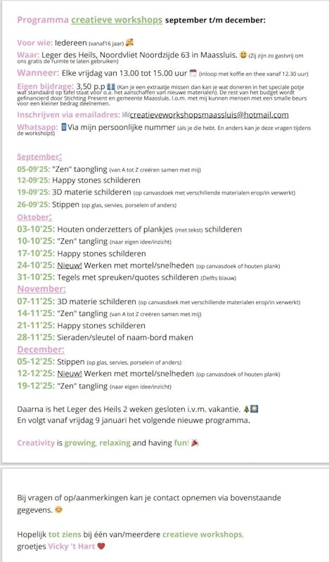 Je kunt jezelf opgeven via Fb: Vicky's creatieve workshops of Vicky 't Hart, WhatsApp (nummer kan je vragen tijdens de workshops) of deze site.