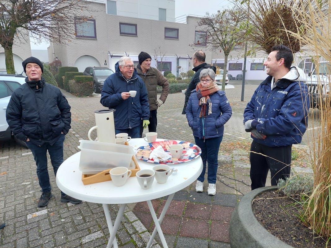Het opzetten van de kerstboom werd voorzien van koffie en koek en na gedane arbeid kwam een heerlijk warme pan met glühwein op tafel. Koffie, spijs en glühwein werd gemaakt door een aantal buurvrouwen die de mannen hiermee wilden ondersteunen. Voor het aanbrengen van de lichtjes is altijd wel een buurman te vinden die met een hoge ladder de boom in durft!