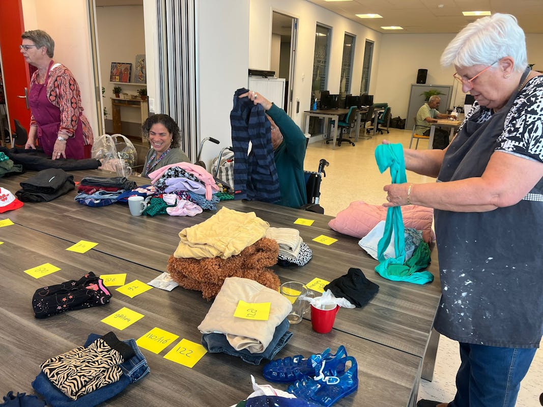 Vrijwilligers en cliënten van het activiteitencentrum gingen samen aan de slag om de ingebrachte kinderkleding "kleding met liefde" te sorteren voor de aankomende pop-up store Tiptop voor Nop for Kids. Doos na doos, tas na tas werd uitgepakt, kledingstukken werden zorgvuldig gesorteerd op maat en op jongen of meisje. Het was hard werken, maar met veel plezier en een glimlach op ieder gezicht.