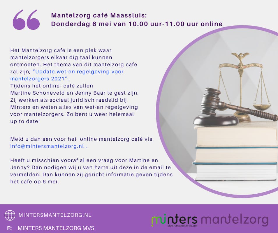 Het Mantelzorg café is een plek waar mantelzorgers elkaar digitaal kunnen ontmoeten. Het thema van dit mantelzorg café zal zijn; “Update wet-en regelgeving voor mantelzorgers 2021”. Tijdens het online- café zullen Martine Schoneveld en Jenny Baar te gast zijn. Zij werken als sociaal juridisch raadslid bij Minters en weet alles van wet-en regelgeving voor mantelzorgers. Zo bent u weer helemaal up tot date!