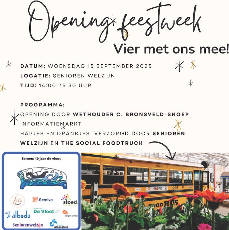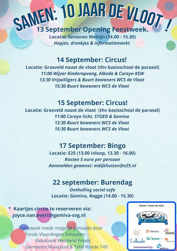 Gemiva organiseert samen met Stichting Onder Een Dak, Careyn, Albeda Zorgcollege Maassluis, Wijzer in Opvang & Onderwijs , E25 zorg en welzijn , Seniorenwelzijn & Gemeente Maassluis een feestweek ter ere van dit jubileum. Samen: 10 jaar de vloot.
