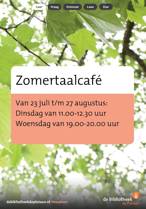 Bij het TaalcafĂ© in Bibliotheek De Plataan oefen je elke dinsdag samen Nederlands in een gezellige en ontspannen sfeer. Of je nu net begint of al wat verder bent â iedereen is welkom!