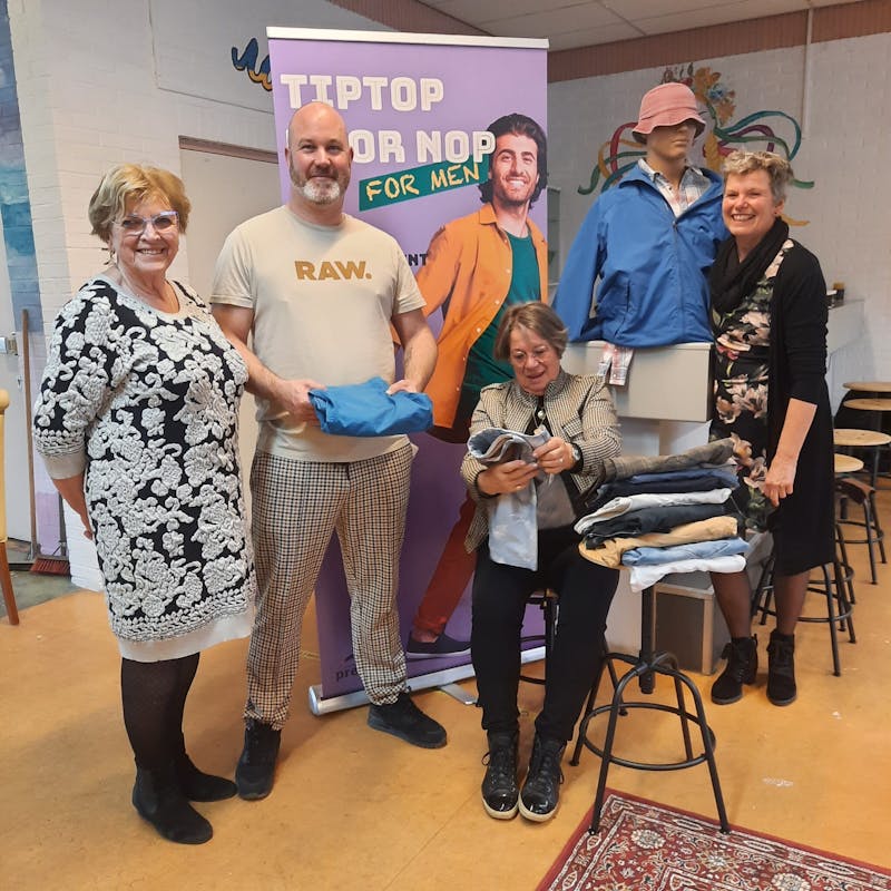 Maandagmiddag was het zover, de 2e editie van Tiptop voor Nop for men! De ruimte in De Vliet zag eruit als een echte kledingwinkel. Maar liefst 45 mannen kwamen op deze tweedehands kledingmarkt af: mannen uit Syrië, Oekraïne, mannen vanuit De Stoed allemaal mochten ze gratis hun outfit uitkiezen. De sneakers voor elke man één paar, geschonken door ADA Textiel Recycling, gingen als warme broodjes. Er was heerlijke appelplaatcake en walnotentaart gebakken door vrijwilliger Erna. Ook de Turkse pizza’s mochten niet ontbreken. En dj Ruud zorgde voor heerlijke muziek, echte meezingers!