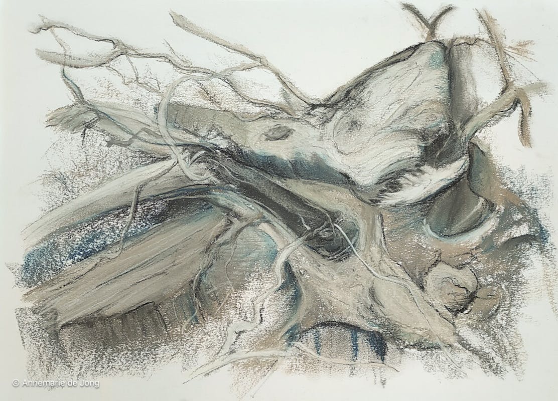 Maassluise Kunstenaar Annemarie de Jong keek deze zomer naar boomwortels en zag ze ineens overal. Het idee kwam voort uit de uitnodiging van Kunsthalte 6, galerie in Naaldwijk, om in augustus daar te komen exposeren. Er zou nog een kunstenaar met 3D-werk bij gezocht worden. En zo kwam het dat ze gekoppeld werd aan Sigrid Schilperoort, die, u raadt het al, 3D-werk maakt van boomwortels.