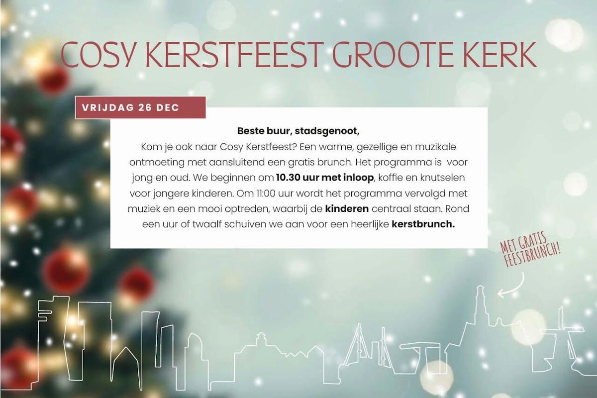 Kom je ook naar Cosy Kerstfeest? Een warme, gezellige en muzikale ontmoeting met aansluitend een gratis brunch. Het programma is er voor jong en oud. We beginnen om 10.30 uur met inloop, koffie en knutselen voor jonge kinderen. Om 11:00 uur wordt het programma vervolgd met muziek en een mooi optreden, waarbij de kinderen centraal staan. Rond een uur of twaalf schuiven we aan voor een heerlijke kerstbrunch.