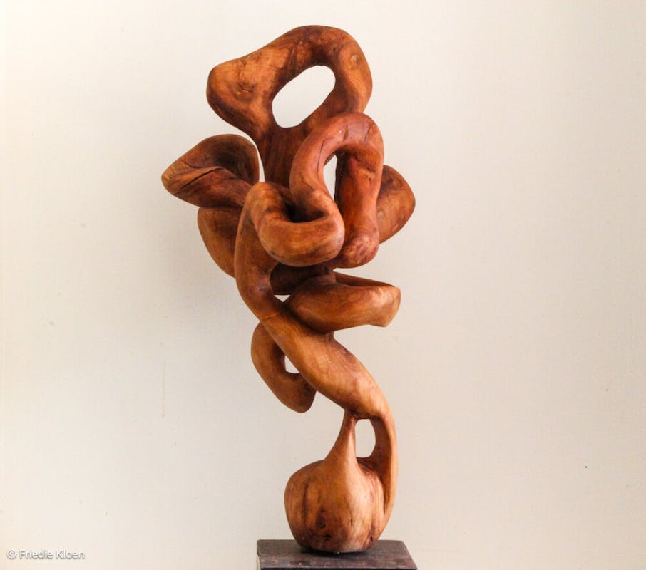 Friedie exposeert met een zelf ontworpen kast waarin een verzameling van haar werk en werkwijze te zien is, zowel figuratieve- als abstracte beelden van verschillende houtsoorten met verschillende oppervlaktebewerkingen. Naast de kast staat haar laatste beeld van appelhout: rondingen van vormen die in elkaar draaien, als het leven zelf dat een pad zoekt.