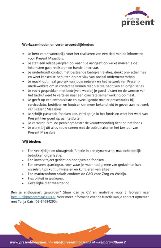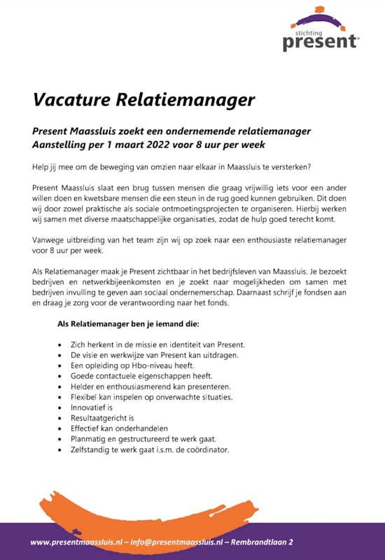 Stichting Present in Maassluis is op zoek naar een ondernemende relatiemanager.