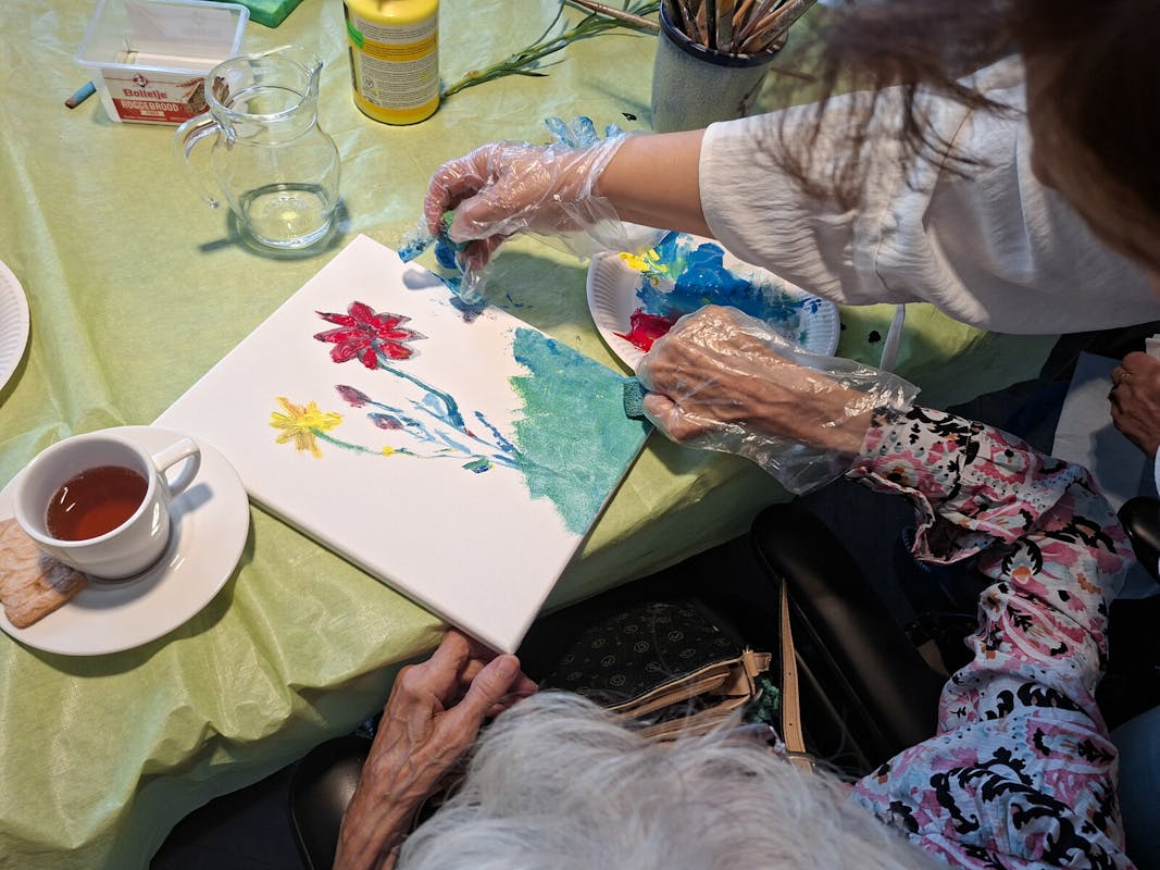Bewoners, vrijwilligers en stagiairs van de Tweemaster kwamen bijeen in de bibliotheekruimte om o.l.v. Gonny en haar kunst-collega Coby Lammers te schilderen. Ter inspiratie konden de bewoners de tentoonstelling over bloemen in de wandelgang bekijken. Sommige deelnemers hadden het schilderen nog echt in de vingers uit vervlogen jaren. Waar een hand onwillig was, stonden de vrijwilligers klaar om ondersteuning te bieden, zodat alle deelnemers aan het eind van de middag een voltooid bloemenschilderij konden meenemen.